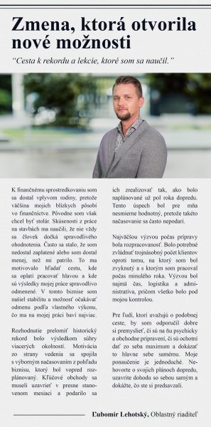 Ďalším z úspešných príbehov je príbeh Ľubomíra Lehotského, ktorý začínal úplne inde, no postupne si našiel cestu k biznisu, kde dnes vidí zmysel, stabilitu aj výsledky svojej práce. Jeho skúsenosť ukazuje, že aj náročné obdobia a výzvy vedia človeka posunúť, ak je ochotný prevziať zodpovednosť a ísť za svojím cieľom naplno.